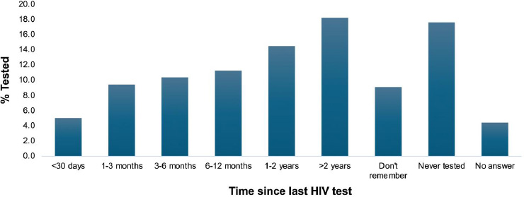 Most Recent HIV Test. Timing of participants’ most recent HIV test based on self-report.