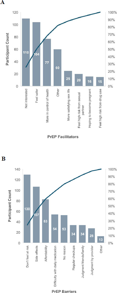 Excluding those who indicated they are not interested in PrEP, the most frequently cited reason for being interested in PrEP was feeling safer (32.7%, n=104). Other motivating factors for PrEP are summarized in (Fig. 3A). By comparison, the most reported reason not to use PrEP was that participants did not feel they were at risk (40.9%, n=130). Other barriers included side effects (33.6%, n=107), affordability (26.1%, n=83), and difficulty with adherence (17.0%, n=54). PrEP barriers are summarized in (Fig. 3B).