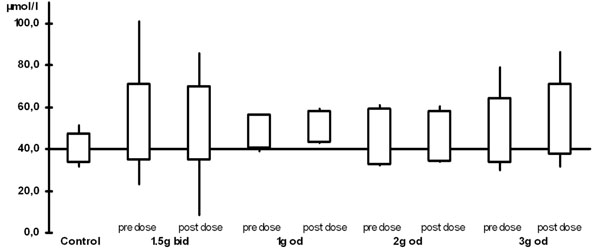 The plasma levels are shown in Table 2 and Figs. (1) and (2). When compared with the control group, all ALCAR plasma levels (pre and post dose) were significantly higher in the treatment groups (p < 0.02). For L-carnitine, all post dose level were significantly higher than in the control group (p < 0.03). Pre dose levels, however, were only significantly higher in the groups taking 1.5g twice daily (p = 0.03) or 2g once daily (p = 0.008). Accordingly, post dose levels were significantly higher than pre dose levels in patients taking 1g or 3g once daily (p <0.05). There was no significant difference between any of the plasma levels (ALCAR and L-carnitine) in the treatment groups. In particular, there was no difference between once daily and twice daily regimen.